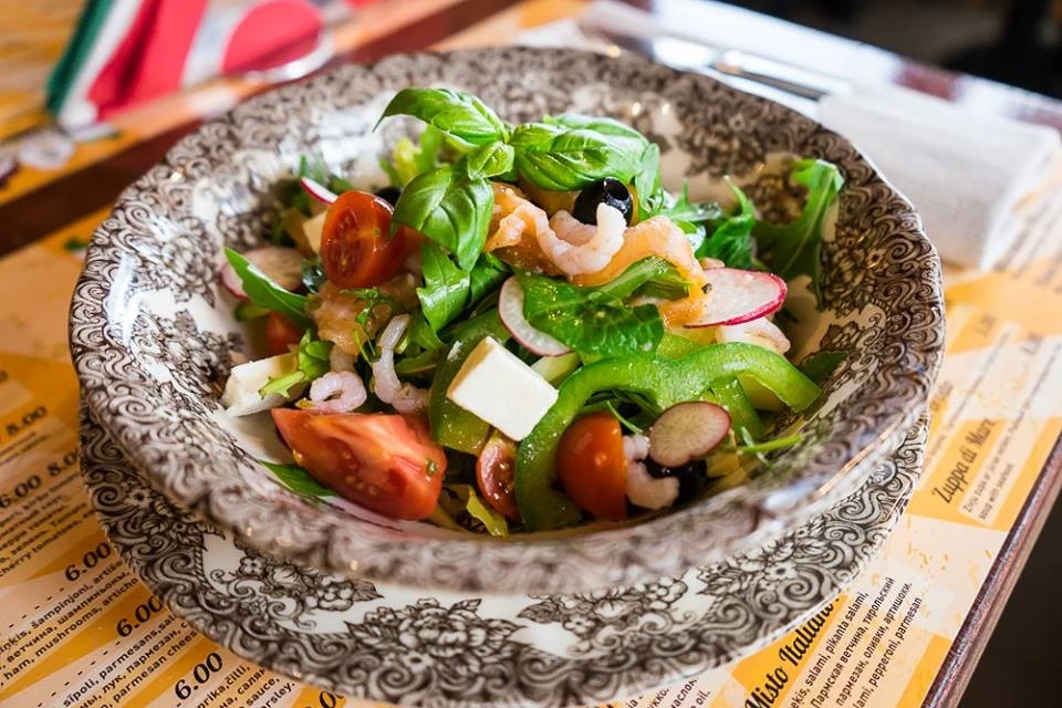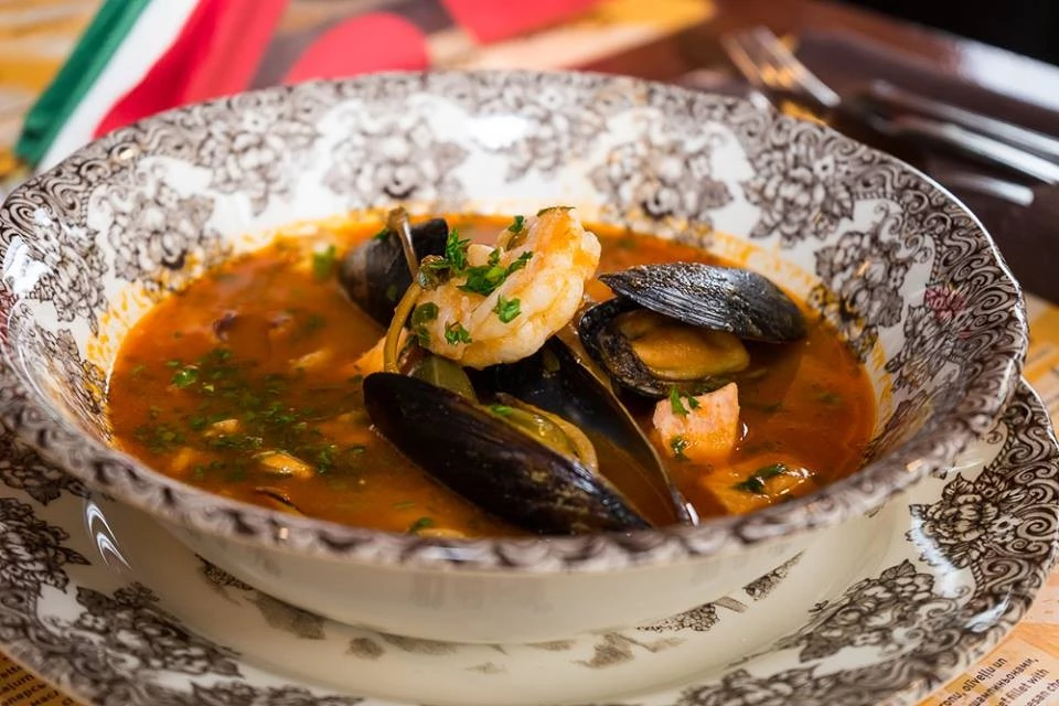 Tomato sauce, mozzarella, shrimps, parmesan cheese, garlic oil, parsley.